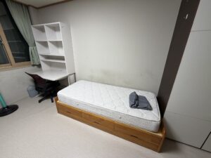 まず部屋についてです。部屋は2人部屋です。部屋にはベッド、机、クローゼット、トイレと洗面台とシャワーが1つにまとまった浴室があります。初めて寮の部屋を見た時、トイレのあるところでシャワーすることに抵抗がありましたが、今ではすっかり慣れて特に何も思いません。ルームメイトは事前アンケートで指名できました。部屋では冷蔵庫がないことが不便ですが、常温保管できる食べ物を買ったりと工夫して暮らしています。