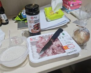寮には冷蔵庫、キッチンがありません。そのため、家でご飯を食べたい場合、近くのコンビニで買ってきたお弁当、カップラーメンを食べたり、デリバリーを頼むのが一般的です。私はどうしても料理がしたいので、1ヶ月に数回ほど一度で食べきれる量のお肉と野菜を買い、勉強机で食材のカット、味付けをして電子レンジで調理したりしています。意外と電子レンジだけでも調理が出来るので驚きました。