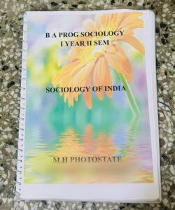 この授業は、インド社会における制度や形態の変化をカースト、部族、クラス、田舎・集落、宗教の観点から分析を行い、社会全体の構造やそのプロセスを考察する科目です。授業自体は、複数の文献が印刷され、一冊の本としてまとめられたテキストを学内の文具関連のお店で購入し、授業で使用しています(下記画像参考)。授業の進め方は、テキストをベースに難しい箇所や具体例が必要な部分を先生が説明するといったスタイルで進んでいきます。時々、一つのテーマに関して作文やディスカッション、プレゼンテーションを求められることもあるため、日々の予習と復習が欠かせません。