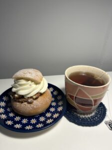 今月の自由テーマでは私の大好きなSemla(セムラ)についてお話ししようと思います。セムラはカルダモンを練り込んだパンに、アーモンドペーストと大量のホイップクリームを挟んだ春の訪れを告げるパンです。もともとはキリストの復活祭の前に行う断食前の火曜日(Fettisdag/通称:ふとっちょの火曜日)にこのカロリーの塊セムラを食べる習慣が起源のようです。漫画ワンピースに登場するビッグ・マムの大好物です。スウェーデンでは年明けからカフェやスーパーで見かけることが増え、カフェに行けばホイップを口にいっぱいつけながらおいしそうに頬張るスウェーデン人をたくさん見かけます。スーパーにはセムラ用のパンが売ってあるほどです。そして私もこのカロリー爆弾のとりこになった一人です。カフェ、スーパーによってパンの固さやホイップの甘さ、アーモンドペーストの特徴が違い食べ比べてマイベストセムラを更新し続けています。最近の私のおすすめはスーパーCOOPと駅前にあるTop Notch Bakeryのセムラです。いろいろ食べ過ぎて細やかな特徴は覚えていませんが、おいしい!という感覚だけは覚えているので間違いない二つだと思います。日本ではIKEAで食べることができるので、このカロリー爆弾を食べながら春の訪れを感じてみてはいかがでしょうか。