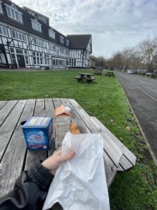 よく「イギリスはご飯がまずい」と聞くと思いますが、全くそんなことはないと思います。少なくとも、こっちに来てから三ヶ月経ちますが、食べて美味しくないと思ったものは少ないです。(あるにはあります)外食は節約のためにほぼしません、大学にもサンドイッチを作って持って行っています。一週間に一回ASDAという大型スーパーに行ってまとめ買いをしています。野菜や果物や安いですがやはり物価は高いです。日本のスーパーには売ってない果物があります。あと、一袋に大量入っているので使い切るのに苦労します。食パンとかも大きいのでカビさせたりも何回もしました、、、。どのスーパーにも共通しているのがパン屋さんのようなコーナがあることです。朝、そこでクロワッサンを買って公園や寮のベンチで食べるのが好きです。(最近は寒すぎるのでできない、、、)あとは、他の国のご飯がとっても美味しいです。コリンデール近くにギロスやライスプラッターの売っている屋台があったり(ここはすごくおいしいです)、アジアのご飯屋さんのフードホールがあったりします。自炊は結構いろんなものが作れます。米は日本のものも売っていますが、高いのでジャスミン米を使っています。日本食とは相性は悪いですが、ガパオライスを作ったりします。また、友達に自分の国のご飯を作ったり、作ってもらったりするのが楽しいです。日本のチェーン店もあります。丸亀製麺、焼肉ライク、居酒屋など。値段は2倍以上です。まだどこも言ってないですが、どうしても日本食が恋しくなったら試したいと思います。