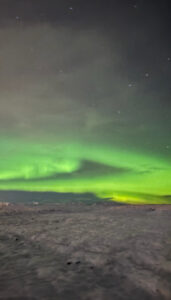 旅の最大のハイライトは、何と言ってもアイスランドでのオーロラ観測です。天候に左右されるため見られるか不安でしたが、幸運にも遭遇することができました。氷点下の澄み切った寒空の下、夜空に揺らめく幻想的な光のカーテンを目にした瞬間の感動は、筆舌に尽くしがたいものがありました。日本では決して味わえないその光景は、自然の雄大さと美しさを改めて教えてくれ、これまでの留学生活の中でも最高峰の思い出となりました。