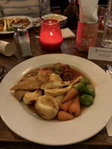 ヨーロッパにおけるクリスマスは、日本のお正月のように家族と過ごす日とされています。その為ほとんどのお店が閉まります。実際に私のフラットメイトも全員実家に帰省し、家族でクリスマスを過ごしていました。その為私が所属しているバドミントンソサエティーでは12月の初めの方にクリスマスパーティーを行いました。クリスマスでよく食べられるターキーなどを食べることができました。これらのイベントを通して、イギリスやその他ヨーロッパ圏の文化を学ぶことができ、非常にいい経験でした。