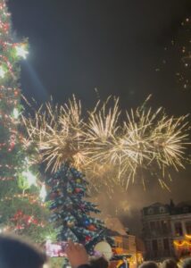 クリスマスや年末は家族と過ごすのが一般的なため、多くの留学生が一時帰国し、街は普段よりも少し静かになります。しかし、年越しの際にはグランプラスのクリスマスマーケットにDJが登場し、音楽とともに大きな賑わいを見せていました。年が変わる瞬間には花火も打ち上げられ、とても印象的な体験となりました。こうした行事を通して、普段とは異なるベルギーの一面を感じることができ、忘れられない年末となりました。